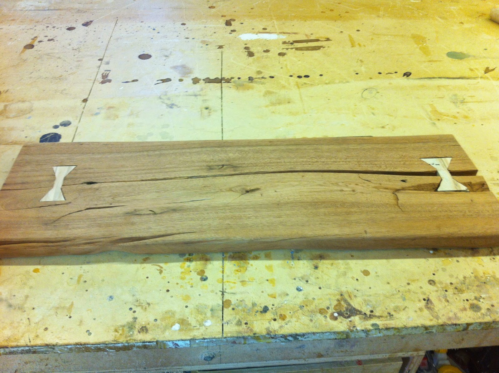These two tables were built from a reclaim Mahogany slab which I hand-carved Maple butterfly keys into.